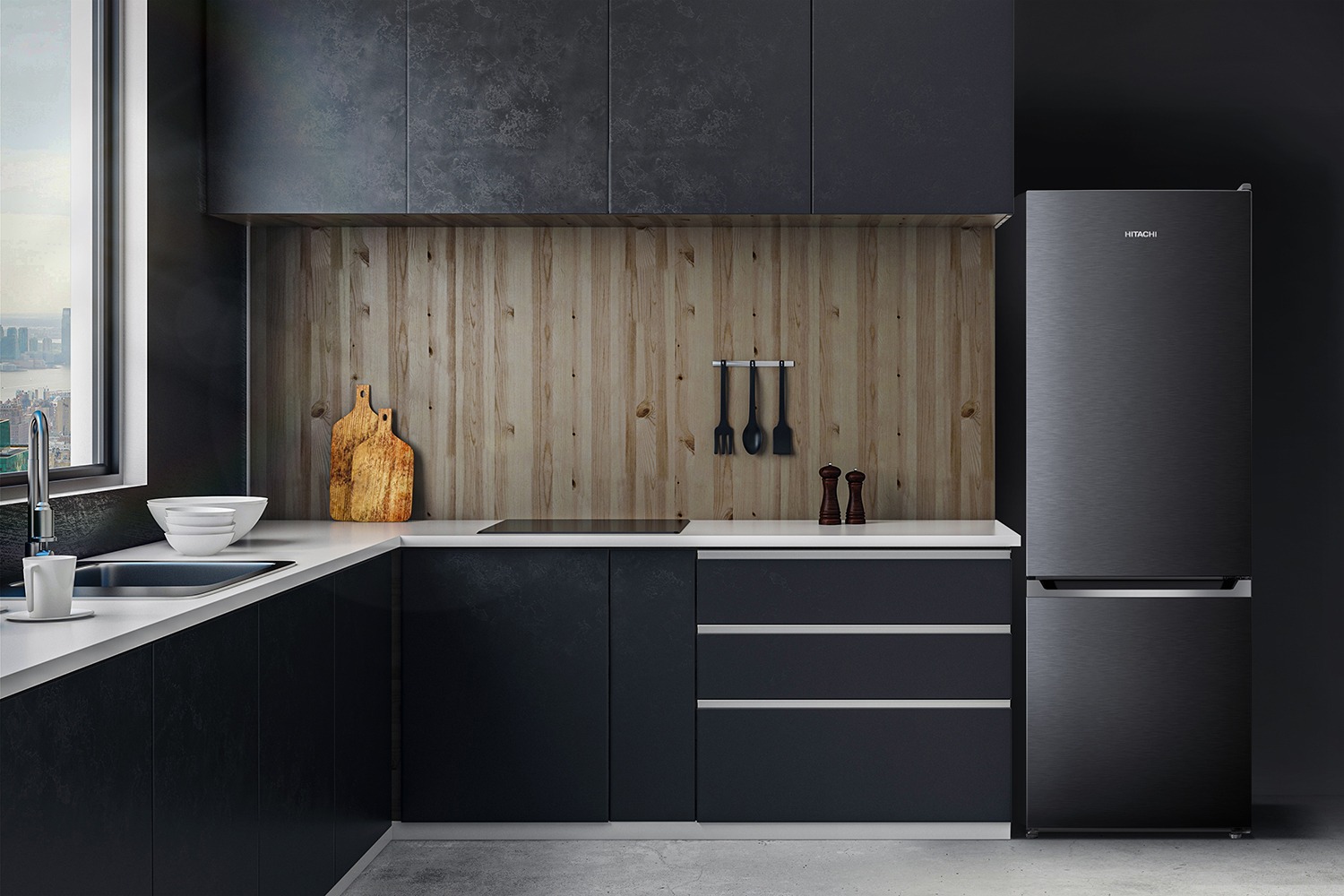 - Tủ lạnh Hitachi với thiết kế kiểu dáng ngăn đá trên, Với màu đen kết hợp dễ dàng với nội thất trong gia đình.