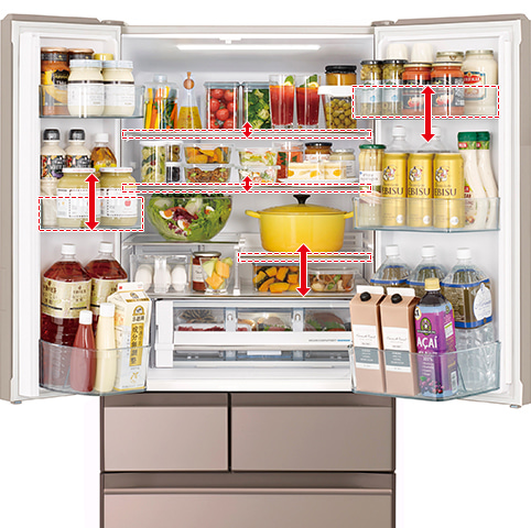 Chiều cao của kệ thứ nhất và thứ hai (từ trên xuống) có thể điều chỉnh theo nhu cầu sử dụng. Có thể lưu trữ chai lọ lớn bằng cách thay đổi vị trí của ngăn kệ bên dưới.