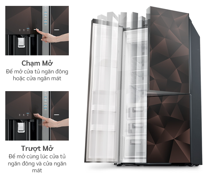 | Tiện ích | - Lấy đá và nước bên ngoài - Cửa tự động - Đệm cửa chống mốc - Chuông báo mở cửa - Không đóng tuyết - Ngăn chân không Vacuum Compartment |