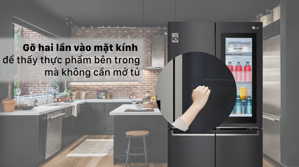 - Thiết kế InstaView™ Door-in-Door® của tủ lạnh LG có tấm kính trong suốt và bật sáng khi gõ nhanh 2 lần cho phép bạn nhìn xuyên thấu được bên trong tủ mà không cần phải mở cửa. Điều này sẽ giúp giảm đáng kể lượng khí lạnh thất thoát, giúp thực phẩm của bạn sẽ được bảo quản tươi lâu hơn.