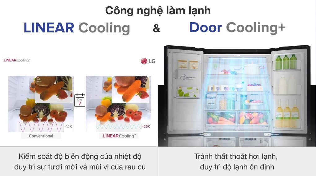- Công nghệ LINEAR Cooling của LG kiểm soát độ biến động của nhiệt độ trong tủ, giúp duy trì hình thức và hương vị của rau củ tươi ngon lâu hơn.