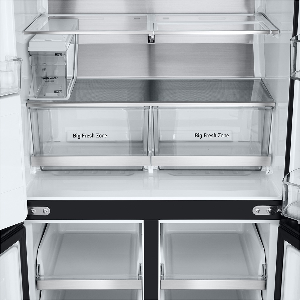 - Thiết kế có các khay kính bên trong và trên cánh cửa tủ để dễ dàng phân loại thực phẩm tươi sống tránh lẫn mùi.