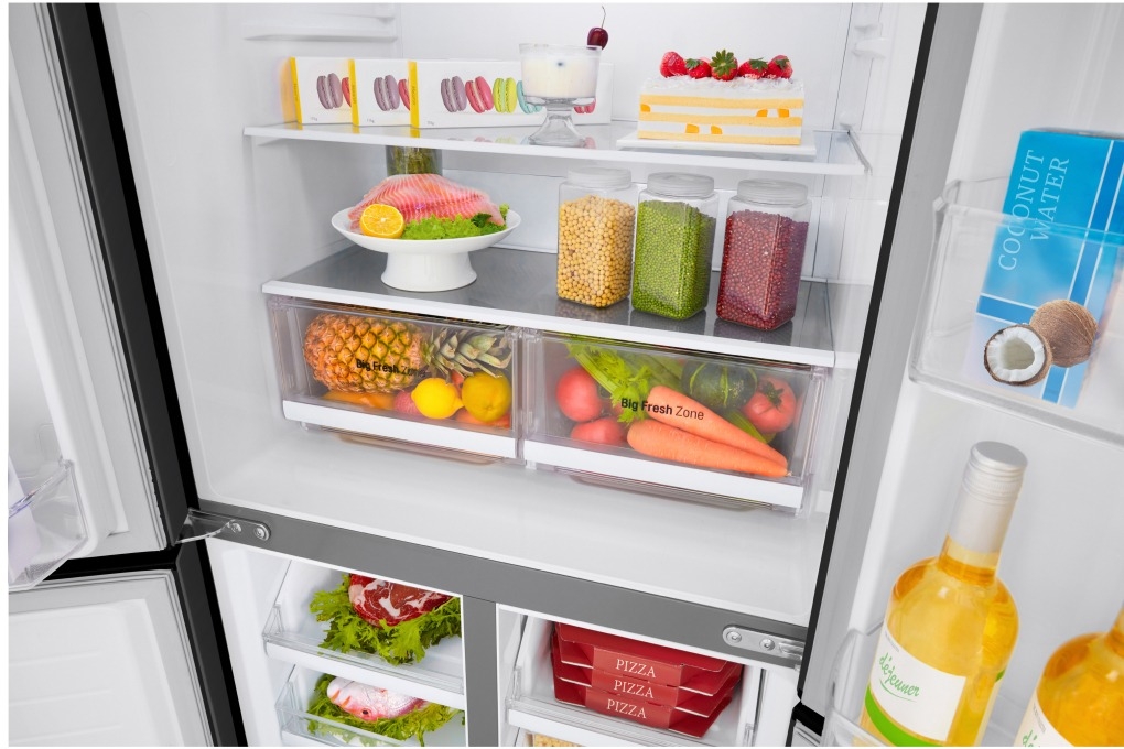 - Ngăn chứa rau quả Big Fresh Zone: Với chế độ điều chỉnh cho rau củ và trái cây riêng biệt để bảo quản tốt hơn, tăng 20% khả năng giữ ẩm để thực phẩm tươi ngon lâu hơn, bảo toàn dưỡng chất và hương vị tốt hơn khi sử dụng.