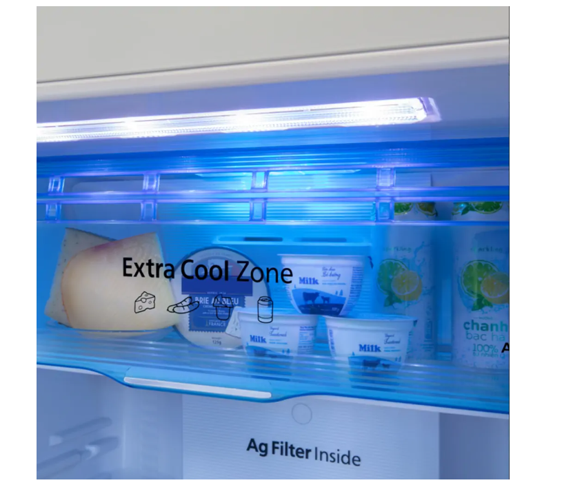 Ngăn Extra Cool Zone giữ lạnh thực phẩm ở nhiệt độ 2°C Ngăn rau củ góc mở rộng tối đa Wide Fresh Case Ngăn trữ đông tinh thể bạc Ag Hygiene Zone |