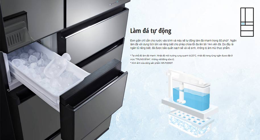 Tủ lạnh Panasonic NR-F503GT-T2 có chức năng làm đá tự động thông minh. Người dùng chỉ cần cho nước vào bình và tủ lạnh sẽ tự động làm đá nhanh trong 80 phút. Ngăn làm đá với dung tích lớn được thiết kế riêng biệt cho sức chứa tối đa lên tới 144 viên đá. Đồng thời, ngăn riêng biệt với ngăn đông nên đá sẽ được bảo quản sạch sẽ và vệ sinh, không bị ám mùi thực phẩm.