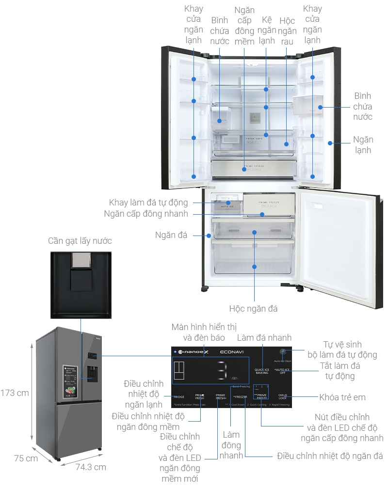 | Công nghệ diệt khuẩn, khử mùi | - NanoeX diệt khuẩn 99.99%, giảm 4.7 lần lưu lượng thuốc trừ sâu - AG+ clean kháng khuẩn, khử mùi - Lấy nước ngoài kháng khuẩn, khử mùi - Làm đá tự động siêu tốc kháng khuẩn, khử mùi |