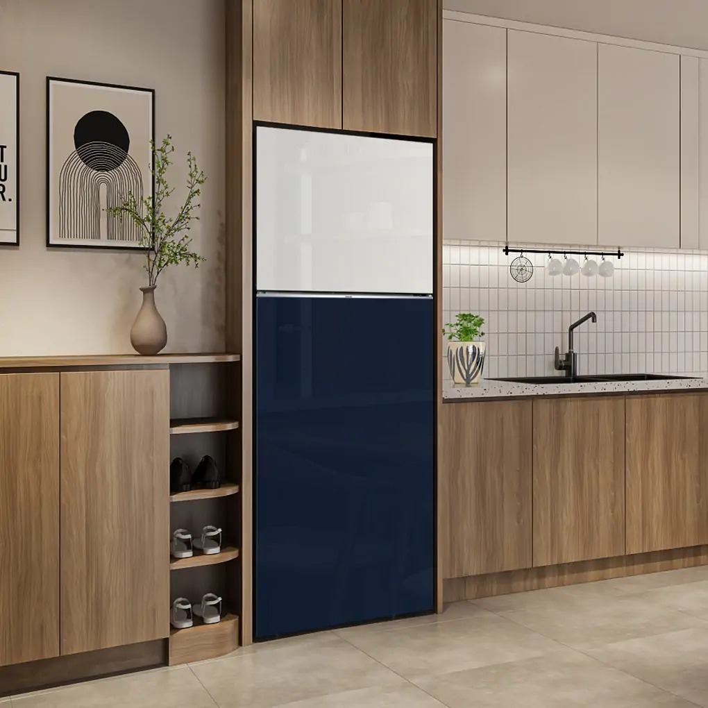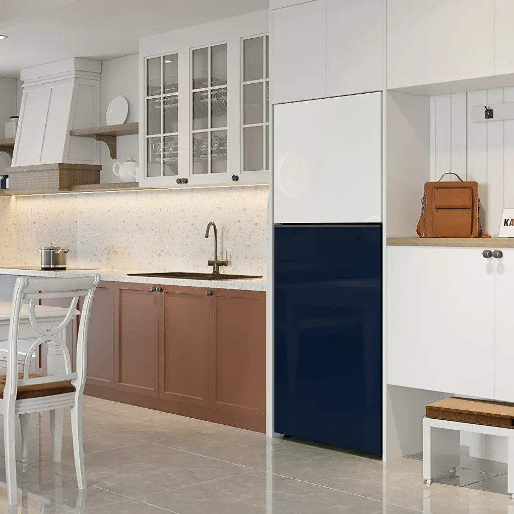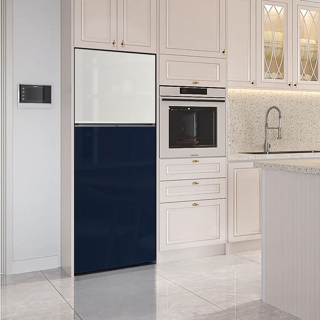 - Tủ lạnh Samsung Bespoke Inverter 305 Lít RT31CB56248ASV có 2 trên và dưới ngăn đá trên trên sở hữu thiết kế Bespoke với phối màu Trắng Thạch Anh/ xanh navy hiện đại, dễ dàng hài hòa với mọi không gian bếp.