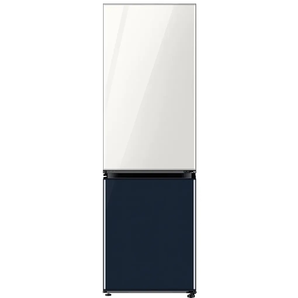 - Tủ lạnh Samsung Bespoke Inverter 339 Lít RB33T307055/SV có 2 ngăn trên và dưới ngăn đá dưới trên sở hữu thiết kế Bespoke với phối màu Trắng Thạch Anh/ Xanh navy hiện đại, dễ dàng hài hòa với mọi không gian bếp.