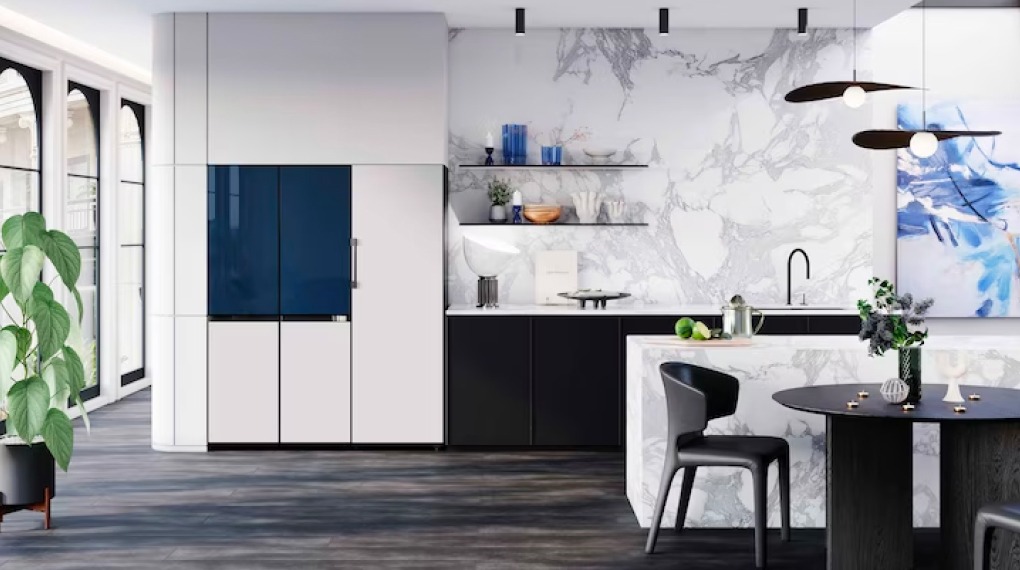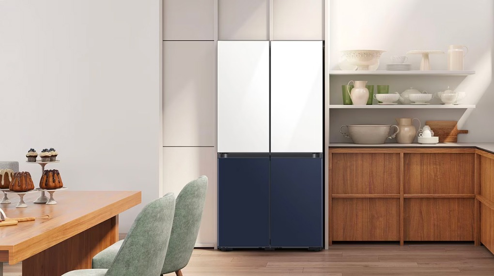 - Kiểu tủ lạnh có mầu trắng/xanh navy sang trọng thời thượng , chất liệu cửa tủ bằng kính Bespoke bền chắc và lịch lãm