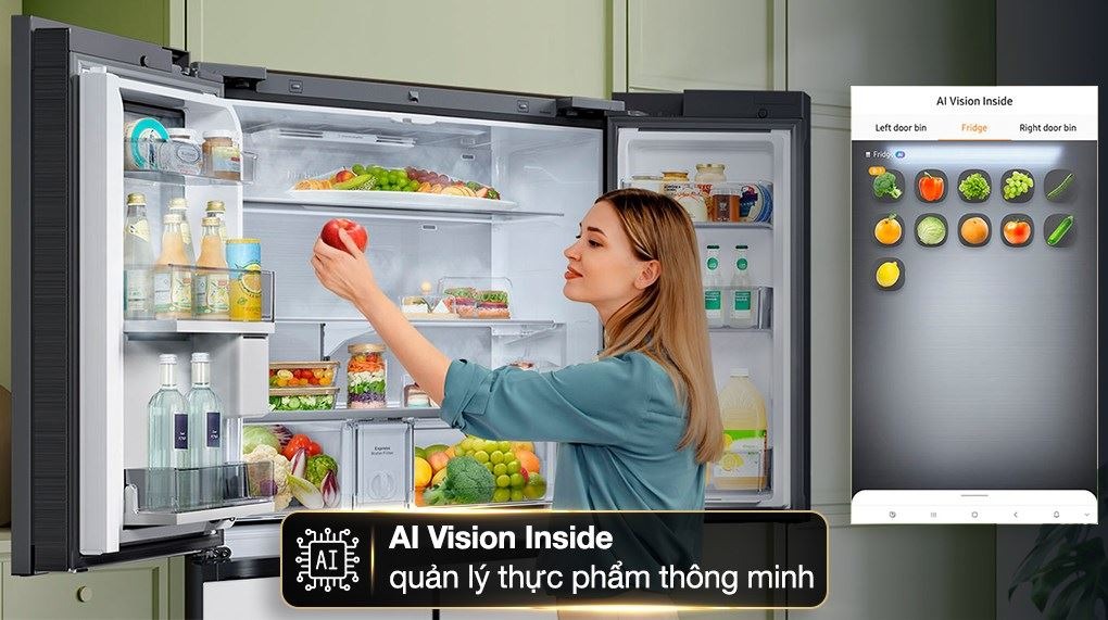 - Quản lý thực phẩm thông minh bằng AI Vision Inside, nhận diện thực phẩm được đưa vào và lấy ra bằng camera bên trong, giúp người dùng quản lý thực phẩm thông qua danh sách hiển thị bằng hình ảnh.