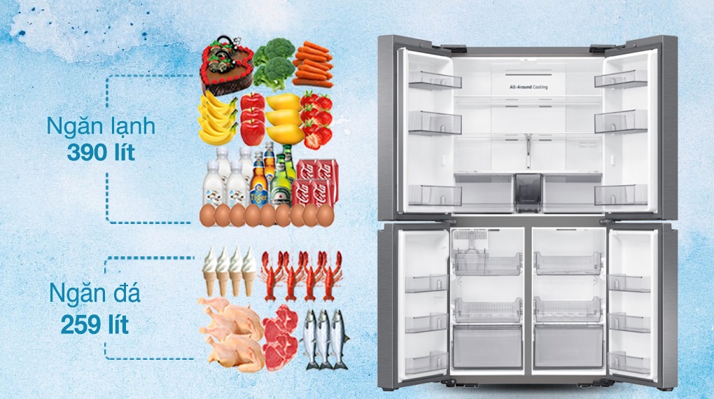 - Với tủ lạnh RF59C700ES9/SV công nghệ All-around Cooling làm lạnh riêng biệt cho từng khay, tạo làn gió đảo chiều khép kín, kiểm soát tối ưu sự thay đổi nhiệt độ để bảo quản thực phẩm tươi lâu hơn mà không xảy ra tình trạng đóng đá cục bộ.