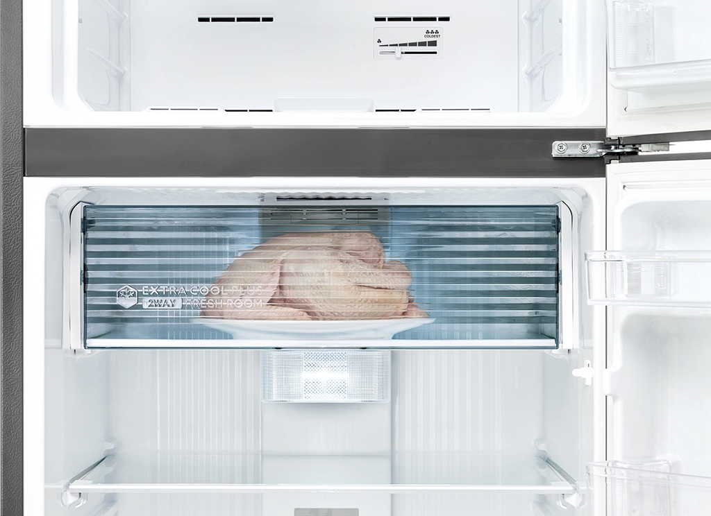 - Ngăn trữ thực phẩm tươi sống Extra cool plus hoạt động ở nhiệt độ -2°C nhờ đó có thể trữ thực phẩm tươi sống tươi ngon trong ngày và nhanh chóng chế biến mà không cần rã đông tốn thời gian.