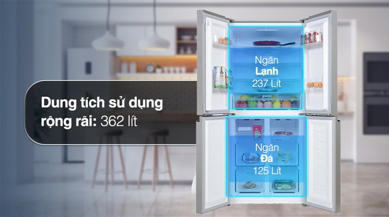 - Kiểu tủ lạnh Multi Door với 4 cánh mở độc lập kiểu cửa Pháp cực kỳ tiện lợi với ngăn mát và ngăn đá rộng rãi, dễ dàng lưu trữ những thực phẩm có kích thước bề ngang lớn. Ngăn mát nằm phía trên giúp bạn dễ dàng quan sát và lấy thực phẩm thường dùng mà không cần cúi xuống tìm kiếm nhiều. Chiếc tủ lạnh Sharp này có dung tích sử dụng 362 lít, trong đó dung tích ngăn đá là 125 lít và ngăn mát là 237 lít, thoải mái lưu trữ nhiều loại thực phẩm cho gia đình 3-5 thành viên.