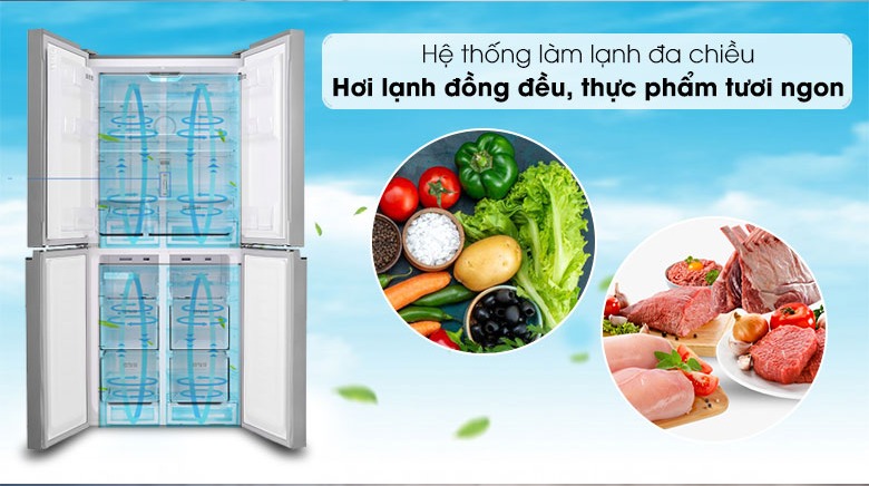 - Công nghệ làm lạnh đa chiều giúp đem luồng hơi lạnh tỏa đều khắp các ngăn tủ, làm lạnh thực phẩm nhanh chóng và hiệu quả hơn, đồng thời hạn chế quá trình oxi hóa thực phẩm, hỗ trợ giữ thực phẩm tươi ngon lâu hơn.