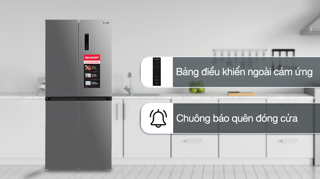 - Tủ lạnh Sharp có thiết kế tủ kiểu dáng Multi Door - 4 cánh ấn tượng, hiện đại kết hợp cùng màu bạc inox làm nổi bật lên vẻ đẹp cho không gian nhà ở.