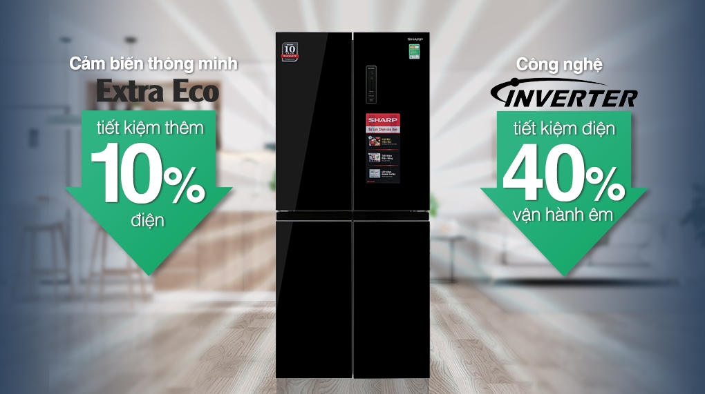 - Tủ lạnh Sharp sử dụng công nghệ Inverter có khả năng điều chỉnh tốc độ quay của hệ thống máy nén giúp máy hoạt động ổn định, làm lạnh ở mức nhiệt phù hợp, hạn chế tiếng ồn động cơ đồng thời đem lại hiệu quả tiết kiệm điện lên đến 40% so với tủ lạnh thông thường.