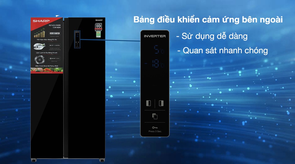 Tủ lạnh Sharp Inverter 532 lít này có bảng điều khiển được bố trí bên ngoài cửa tủ ngăn lạnh. Nó được thiết kế dạng phím cảm ứng sang trọng, dễ sử dụng kèm với màn hình hiển thị chế độ quan sát nhanh chóng.