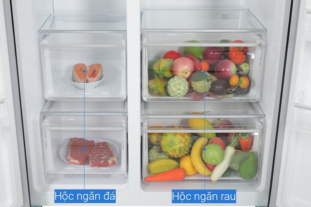 Ngăn đá có dung tích 185 lít, cũng được thiết kế gồm có 3 kệ chia làm 4 ngăn, 1 hộp làm đá viên và 2 ngăn chứa, kèm với 4 khay chứa nằm ở bên cánh cửa tủ.