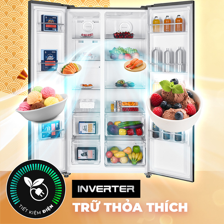- Công nghệ Inverter: Nhờ sử dụng công nghệ cảm biến AI, tủ lạnh Sharp SJ-SBX530VG-BK có khả năng tự điều chỉnh nhiệt độ và duy trì độ lạnh ổn định, từ đó bảo quản tối ưu thực phẩm. Đồng thời, công nghệ này còn kiểm soát hoạt động máy nén để mang lại hiệu quả sử dụng tiết kiệm điện đến 45%.