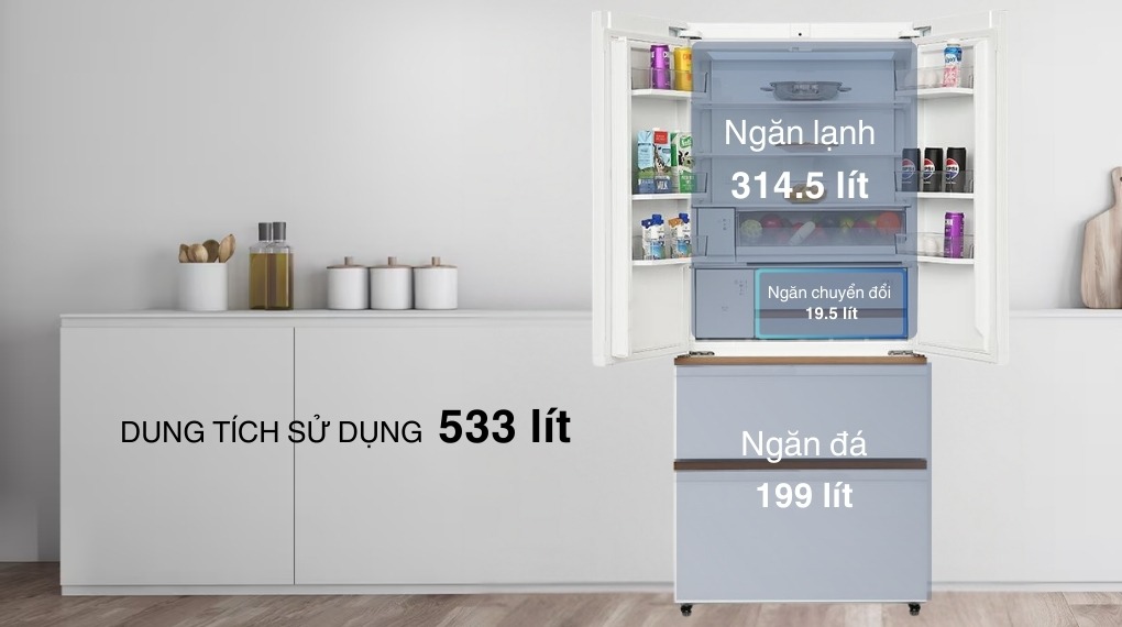 - Tủ lạnh Toshiba Inverter 533 lít Japandi Multi Door GR-RF690WI-PGV(67) có dung tích sử dụng ngăn lạnh 314.5 lít và dung tích ngăn chuyển đổi 19.5 lít.