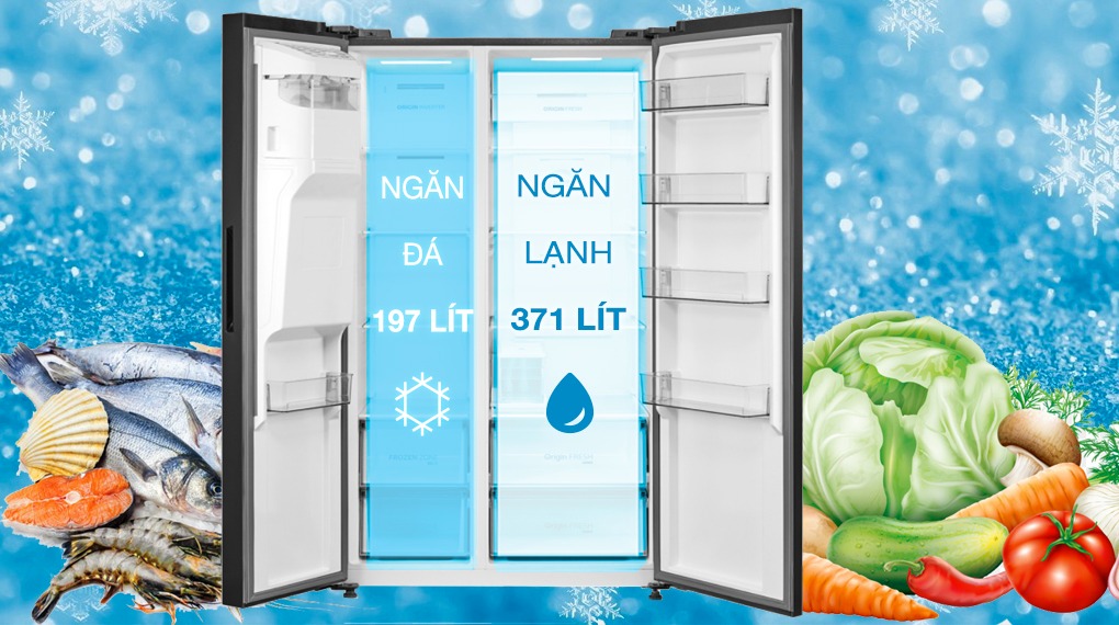 - Ngăn đá có dung tích 197 lít. Bên trong tủ được thiết kế 3 kệ chia làm 4 ngăn, 2 ngăn chứa cùng với 1 hộc làm đá tự động và 1 khay chứa nằm ở bên cánh cửa tủ lạnh.